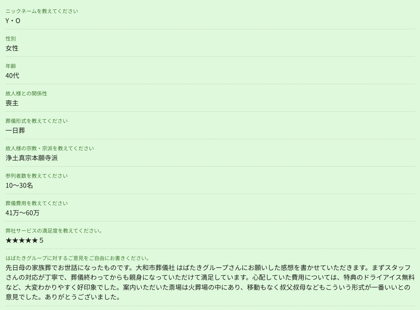 お客様先日母の家族葬でお世話になったものです。大和市葬儀社 はばたきグループさんにお願いした感想を書かせていただきます。まずスタッフさんの対応が丁寧で、葬儀終わってからも親身になっていただけて満足しています。心配していた費用については、特典のドライアイス無料など、大変わかりやすく好印象でした。案内いただいた斎場は火葬場の中にあり、移動もなく叔父叔母などもこういう形式が一番いいとの意見でした。ありがとうございました。