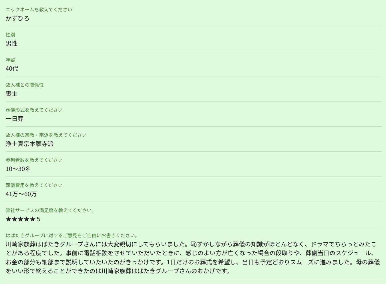 お客様川崎家族葬はばたきグループさんには大変親切にしてもらいました。恥ずかしながら葬儀の知識がほとんどなく、ドラマでちらっとみたことがある程度でした。事前に電話相談をさせていただいたときに、感じのよい方が亡くなった場合の段取りや、葬儀当日のスケジュール、お金の部分も細部まで説明していたいたのがきっかけです。1日だけのお葬式を希望し、当日も予定どおりスムーズに進みました。母の葬儀をいい形で終えることができたのは川崎家族葬はばたきグループさんのおかげです。