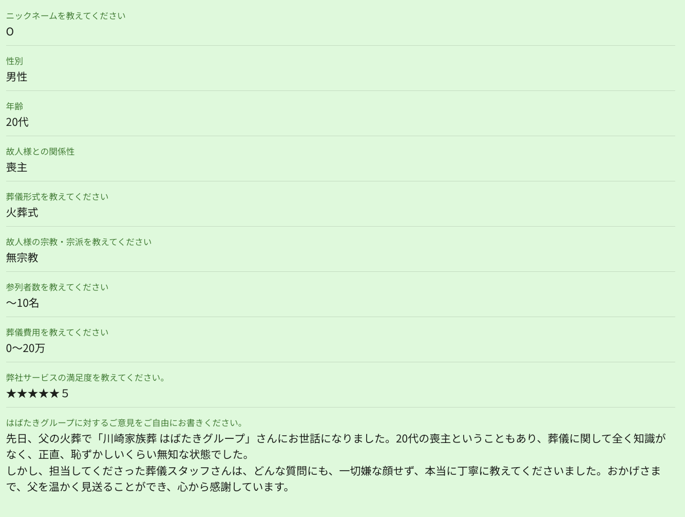 お客様先日、父の火葬で「川崎家族葬 はばたきグループ」さんにお世話になりました。20代の喪主ということもあり、葬儀に関して全く知識がなく、正直、恥ずかしいくらい無知な状態でした。 しかし、担当してくださった葬儀スタッフさんは、どんな質問にも、一切嫌な顔せず、本当に丁寧に教えてくださいました。おかげさまで、父を温かく見送ることができ、心から感謝しています。