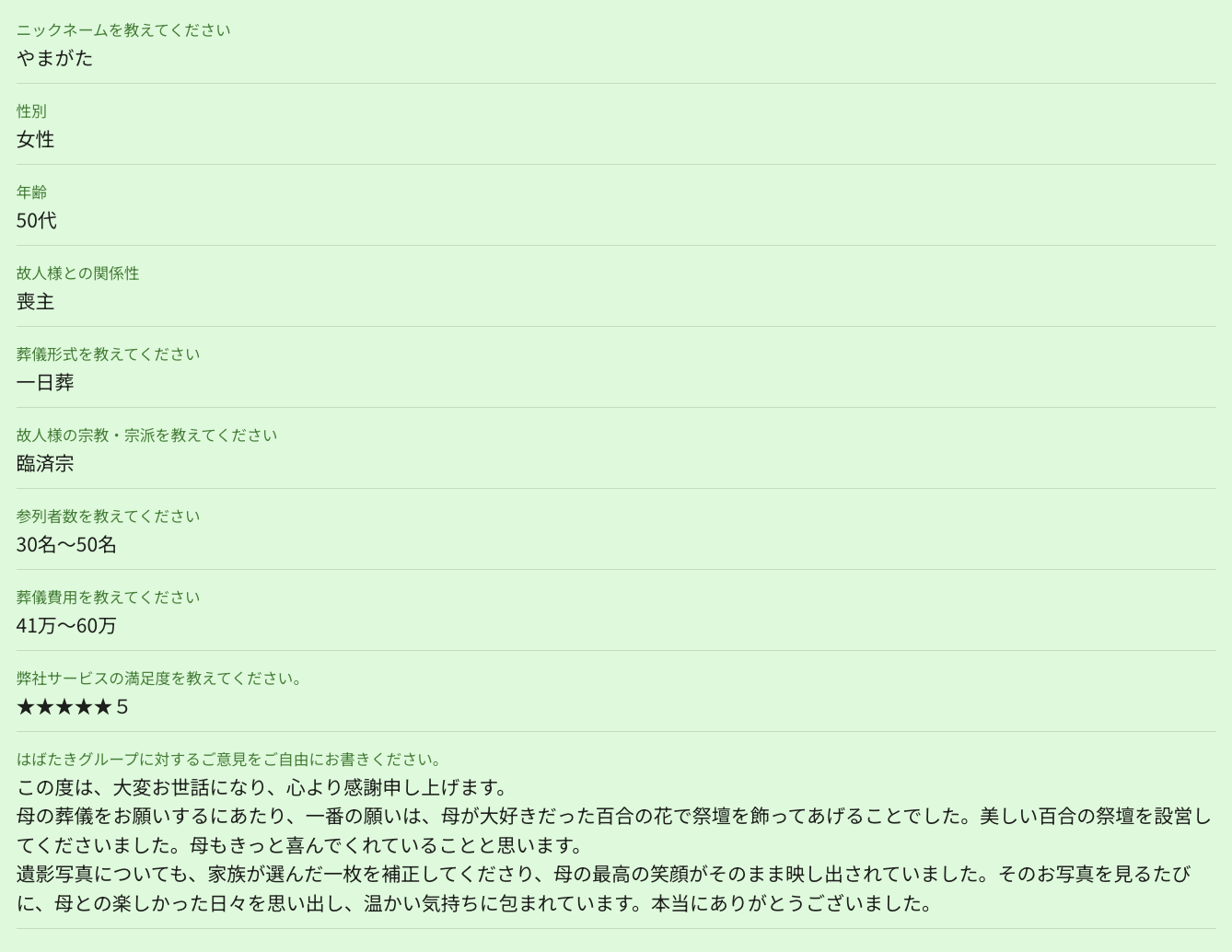お客様この度は、大変お世話になり、心より感謝申し上げます。 母の葬儀をお願いするにあたり、一番の願いは、母が大好きだった百合の花で祭壇を飾ってあげることでした。美しい百合の祭壇を設営してくださいました。母もきっと喜んでくれていることと思います。 遺影写真についても、家族が選んだ一枚を補正してくださり、母の最高の笑顔がそのまま映し出されていました。そのお写真を見るたびに、母との楽しかった日々を思い出し、温かい気持ちに包まれています。本当にありがとうございました。