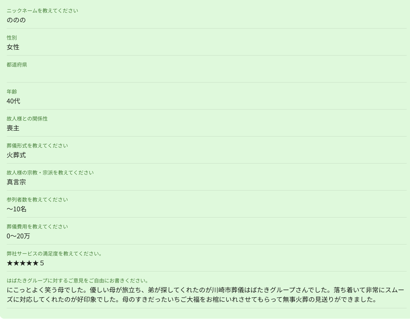 川崎市葬儀 はばたきグループでございます。この度は、お母様の葬儀に際し、弊社「川崎市葬儀 はばたきグループ」をご利用いただき、誠にありがとうございました。いつもにこやかに笑っていらしたお優しいお母様が旅立たれたとのこと、心よりお悔やみ申し上げます。そのようなお辛い状況の中、弟様が弊社をお探しくださり、落ち着いてスムーズに対応できたことが好印象であったとのこと、大変光栄に存じます。お母様がお好きだったいちご大福をお棺にお入れになり、無事にお見送りができたとお伺いし、スタッフ一同、安堵いたしました。故人様への最後の想いを形にするお手伝いができたことを嬉しく思います。お忙しい中、温かいご感想をお寄せいただき、重ねて御礼申し上げます。
