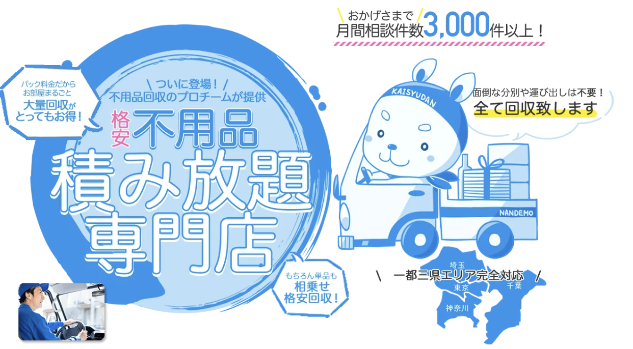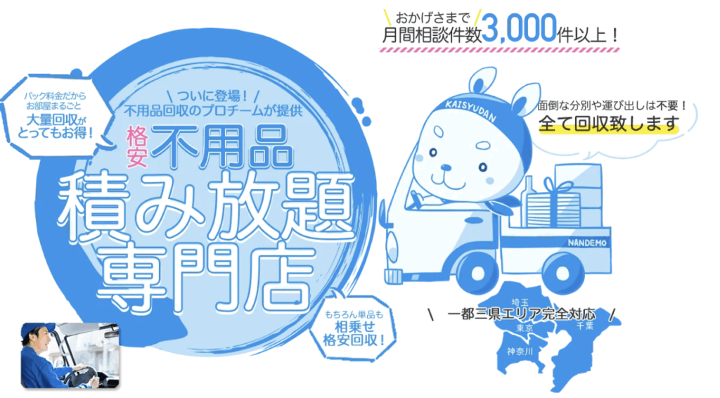 不用品なんでも回収団は、関東一円に対応する不用品回収の専門業者です。家庭の不用品処分から、引越し時の大量片付け、ゴミ屋敷の清掃、遺品整理まで幅広く対応。年中無休で営業しており、早朝や夜間の相談も受け付けているため、スケジュールが限られる方にも便利にご利用いただけます。