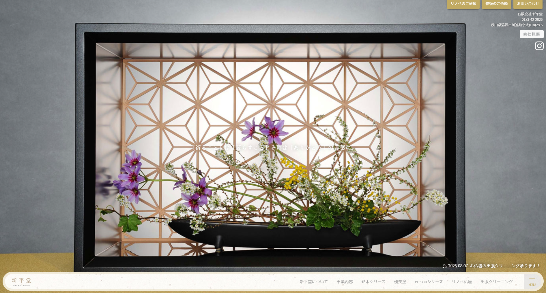 有限会社新平堂は、秋田県湯沢市に本社を構える、昭和25年創業の仏壇・仏具製造メーカーです。川連漆器をはじめとする伝統技術と現代デザインを融合させた「en:sou」シリーズや「優美塗」シリーズなど、現代の暮らしに調和する供養家具を展開しています。