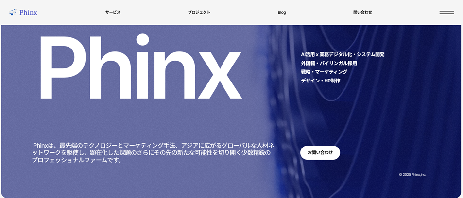 株式会社Phinxは、企業の事業課題に対して、戦略設計からシステム開発、Web制作、デジタルマーケティング、グローバル人材活用までを一気通貫で支援するパートナーです。単なる制作や開発の受託にとどまらず、顧客ごとの課題や事業フェーズに応じて、必要な打ち手をゼロから整理し、実行・定着まで伴走することを強みとしています。
